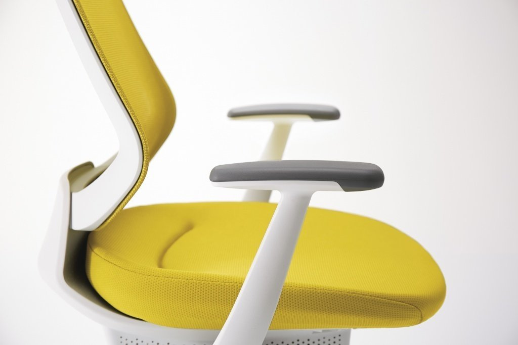 Židle má velmi příjednou opěrku zad z jemné síťoviny. Sedák je potažený textílií v ve stejné barvě jako je barva síťoviny. Područky jsou pevné, mohou sloužit jako opora při balančním pohybu. Kostra židle v černém provedení. Komfort a pohodlí sezení lze ještě zvýšit možností dokoupením 2D stavitelných područek (za příplatek).