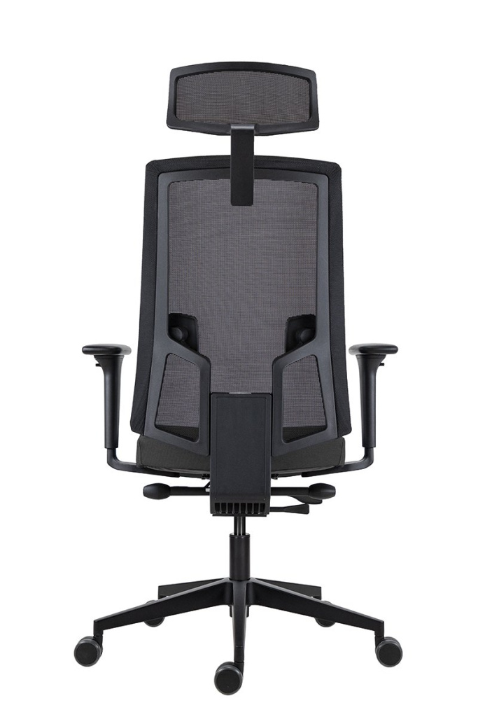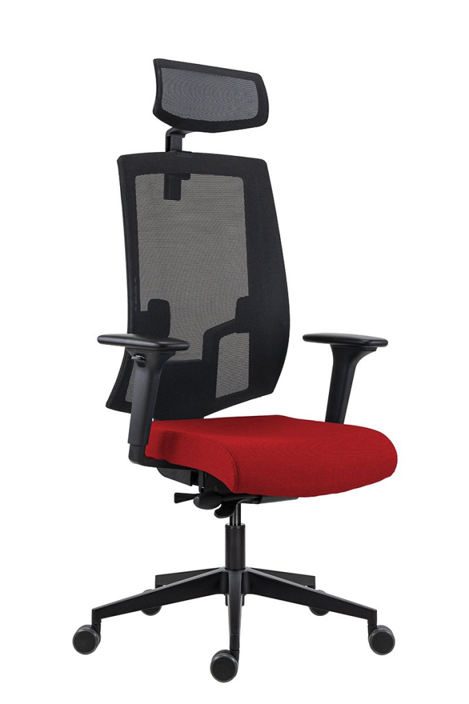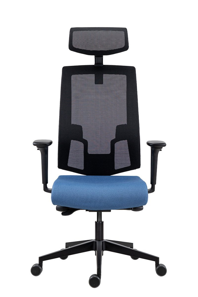 Židle s čalouněným sedákem a s černou síťovinou na opěráku i podhlavníku, výškové nastavení opěráku mechanismem up-down, výškově a vodorovně nastavitelná bederní opěrka s unikátním umístěním a nezávislým nastavením pravé a levé strany, synchronní mechanismus SYN-B s možností plynulé proměny úhlu sedáku a opěráku, možnost aretace v 5 pozicích, nastavení tuhosti mechanismu podle tělesné hmotnosti uživatele se 4 stupni nastavení intenzity, ergonomie exibilní dopředný náklon sedáku opěráku s aretací v základní vodorovné poloze, mechanismus pro nastavení hloubky sedáku, sedák ze studené pěny, vstřikované do formy, síťovaný podhlavník s nastavením výšky, aluminiová báze černá, kolečka Ø 60 mm pro všechny typy povrchů, nosnost 150 kg, záruka 60 měsíců, český výrobek.